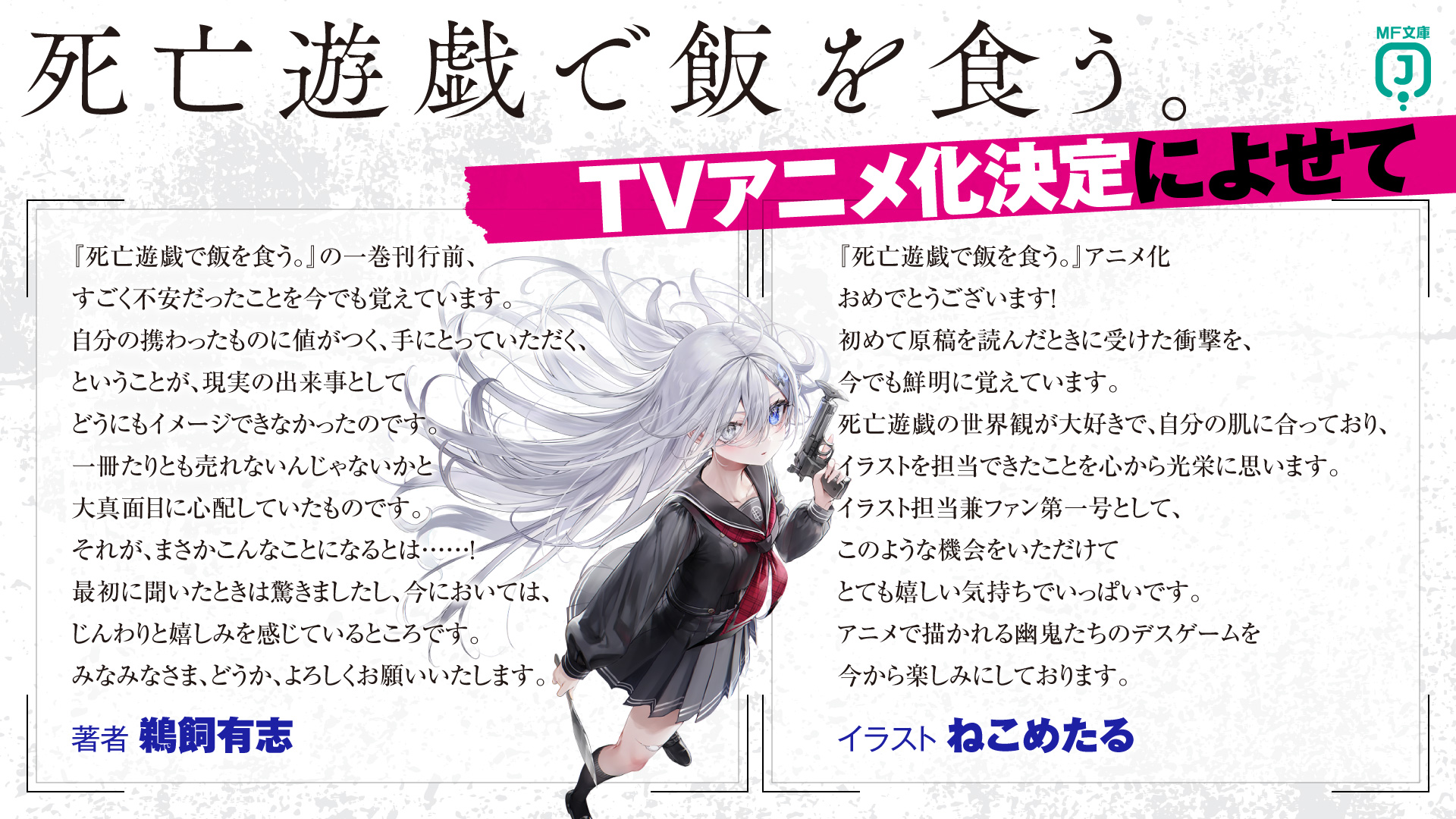 「死亡遊戯で飯を食う。」は「第18回MF文庫Jライトノベル新人賞」にて優秀賞を受賞したライトノベルシリーズ。主人公・幽鬼をはじめとした少女たちが命を懸けたゲーム「死亡遊戯」に挑むストーリーが展開されている。「このライトノベルがすごい!2024」では新作1位に加え、文庫部門2位にも輝いた。小説は最新7巻が9月25日に発売予定。月刊コンプエース(KADOKAWA)ではコミカライズも連載中だ。