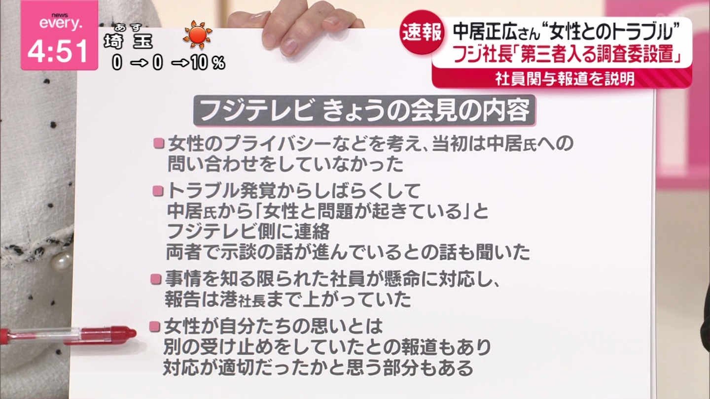 >Nスタのフジテレビの会見を伝えてたリポーターめちゃ声震えてるなぁって思ったら話してる途中で急に違うニュースに切り替わって、なんだか怖い。