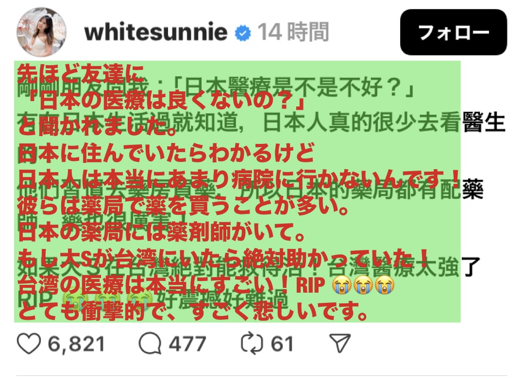 日本の医療が低レベルなせいで台湾有名女優を死なせてしまって申し訳ないわ