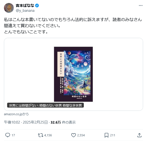 【AI悲報】吉本ばなな、自分が書いてない本をamazonで販売されてしまう