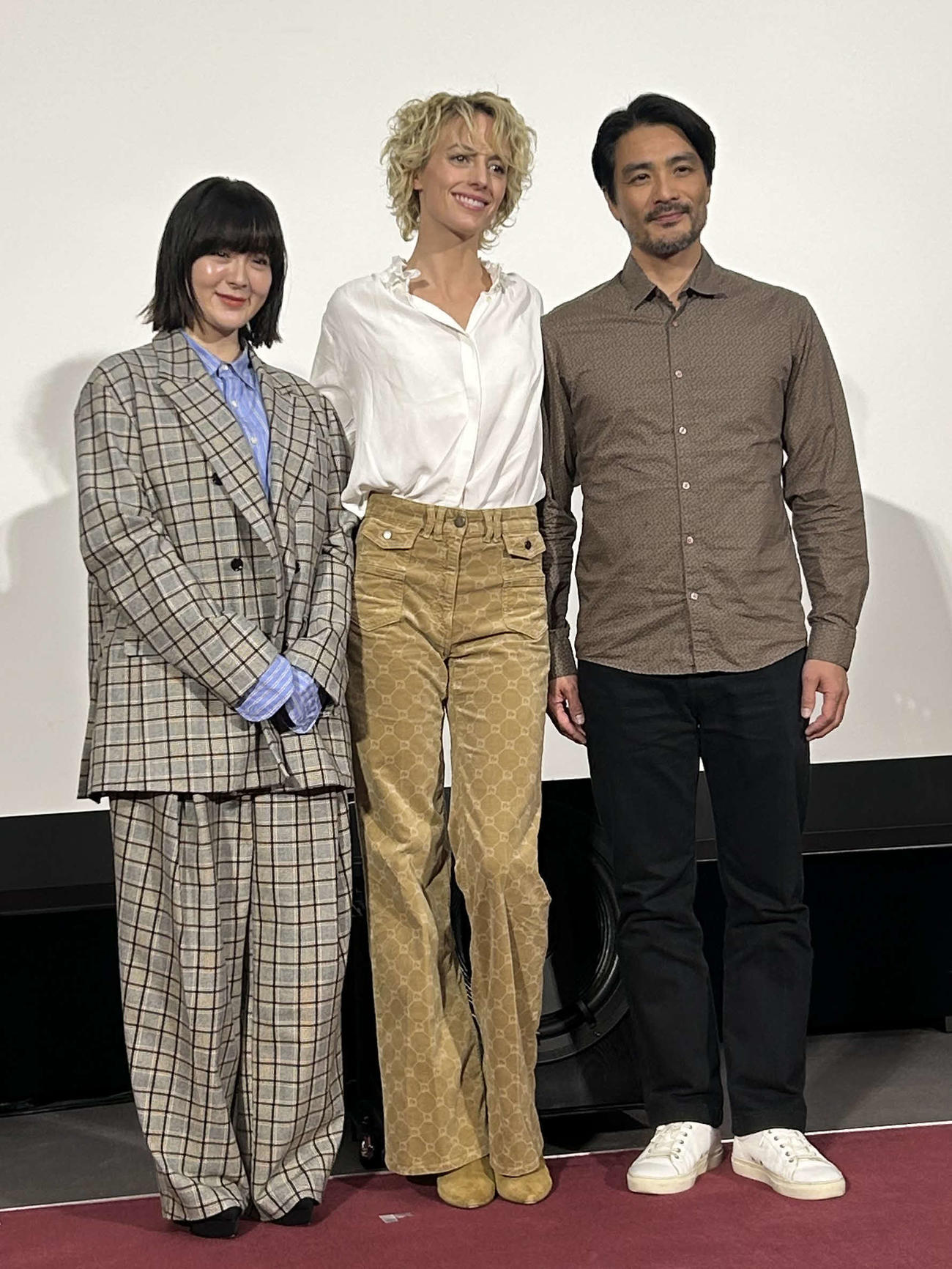 NHKが放送するフランス発の連続ドラマ「アストリッドとラファエル5 文書係の事件録」の出演者記者会見に出席した、左から貫地谷しほり、サラ・モーテンセン、ケンゴ・サイトウ(撮影・松尾幸之介)
