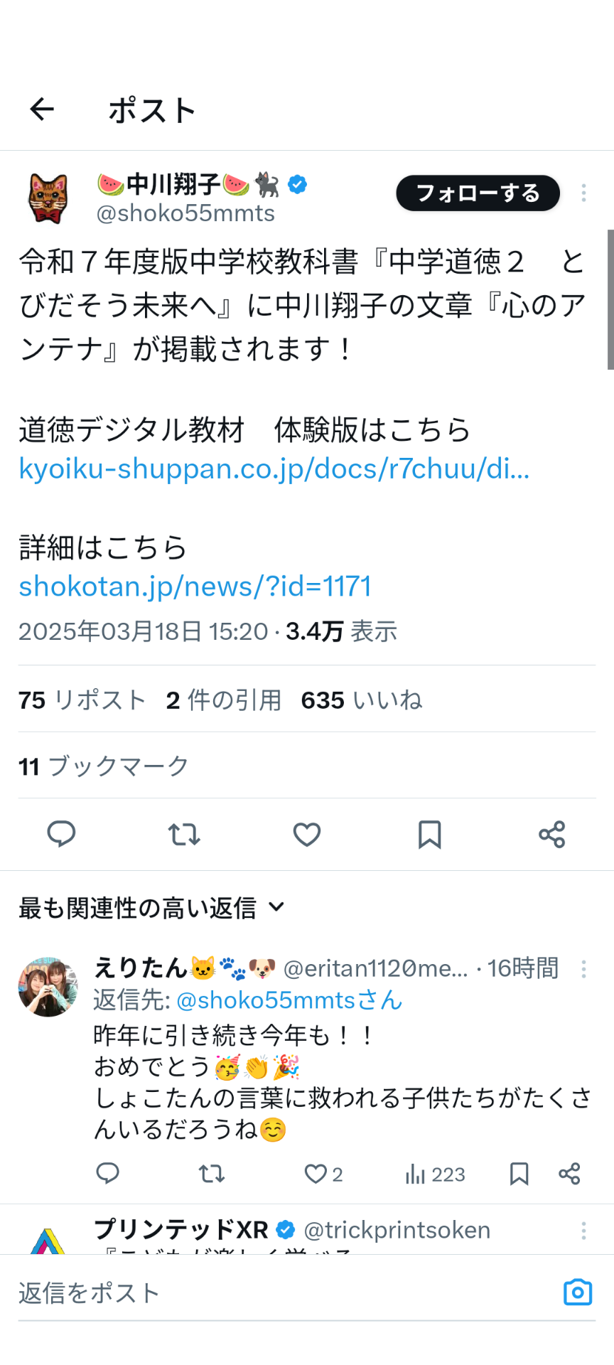 しょこたん「わたしの文章が道徳の教科書に掲載されます!」