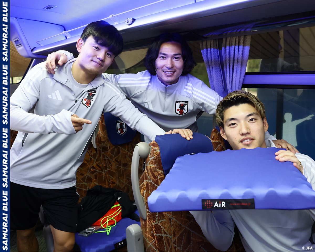 JFAサポーターの西川株式会社より、SAMURAIBLUEのチームバスに[エアーポータブル]クッション/スクエアをご提供いただきました!選手たちの移動をサポートいただき、ありがとうございます」と報告。そして選手たちの表情も含めた車内の写真を公開した。