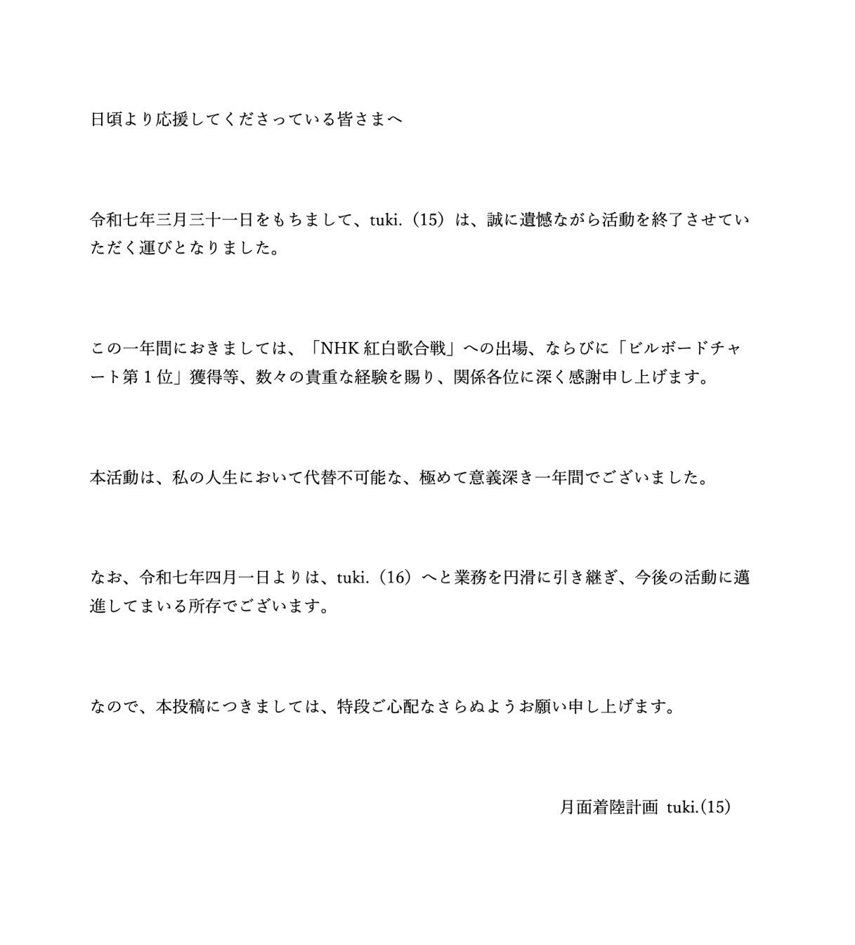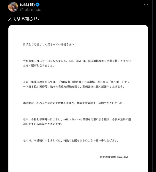 紅白歌手tuki.(15)さん、本日をもって活動終了