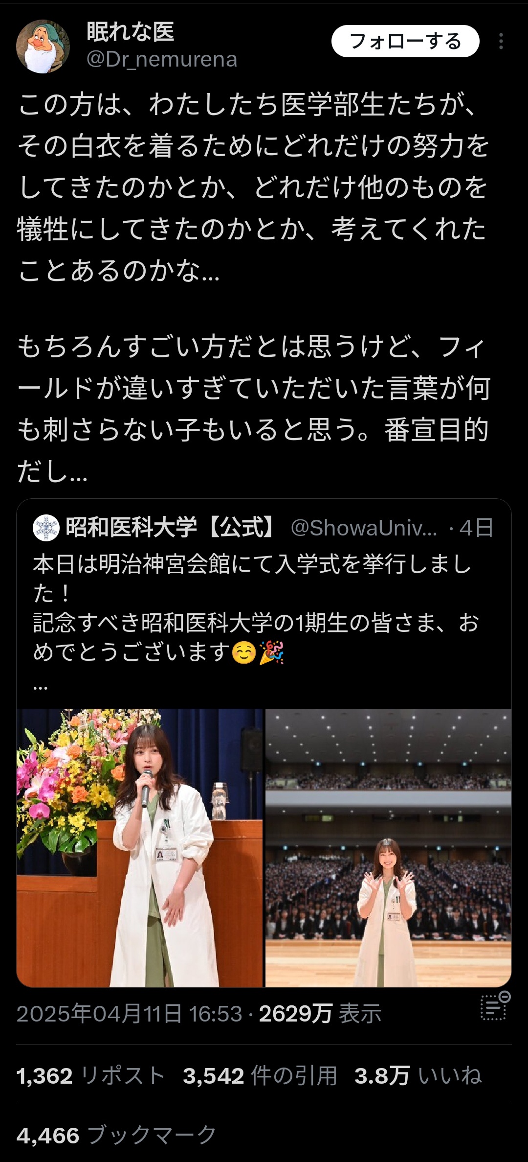 医大の入学式に呼ばれたからそれに合わせただけだろ - 14 : 2025/04/14(月) 13:11:43.30 ID:Ddtx8LNo0