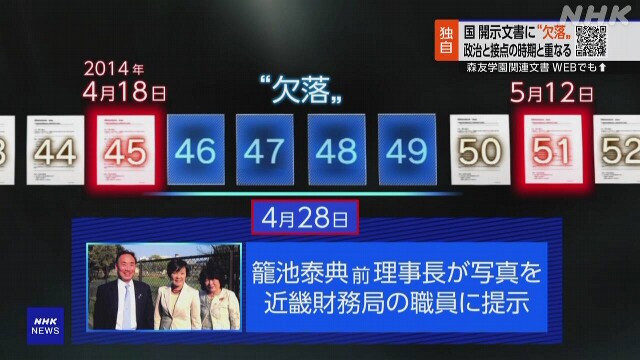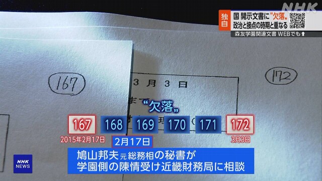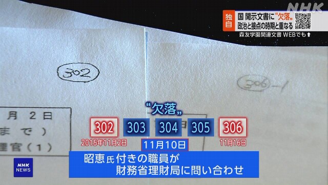 今月、財務省が新たに開示した森友学園に関する文書には、ほぼ時系列で通し番号が振られていますが、この番号が連続して欠落している部分が複数あることがわかりました。NHKが分析したところ、こうした番号の文書が作成されたとみられる時期は、安倍元総理大臣の妻・昭恵氏や国会議員の秘書など、政治と接点があった時期と重なっていました。