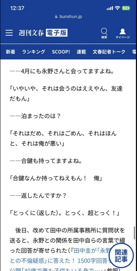 文春  「合鍵返したんですか?」