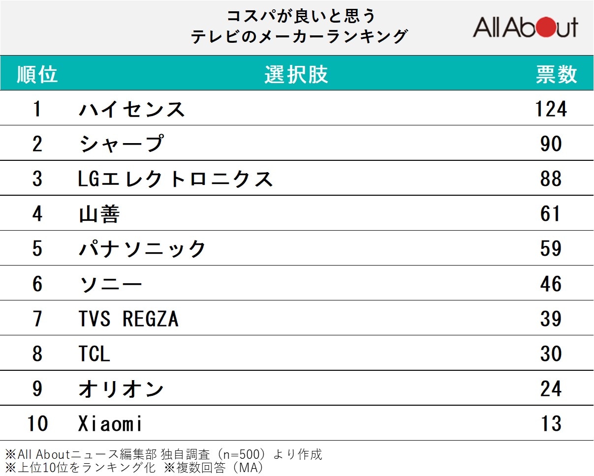 コスパがよいと思う「テレビ」のメーカーランキング! 2位「シャープ」を抑えた1位は「ハイセンス」