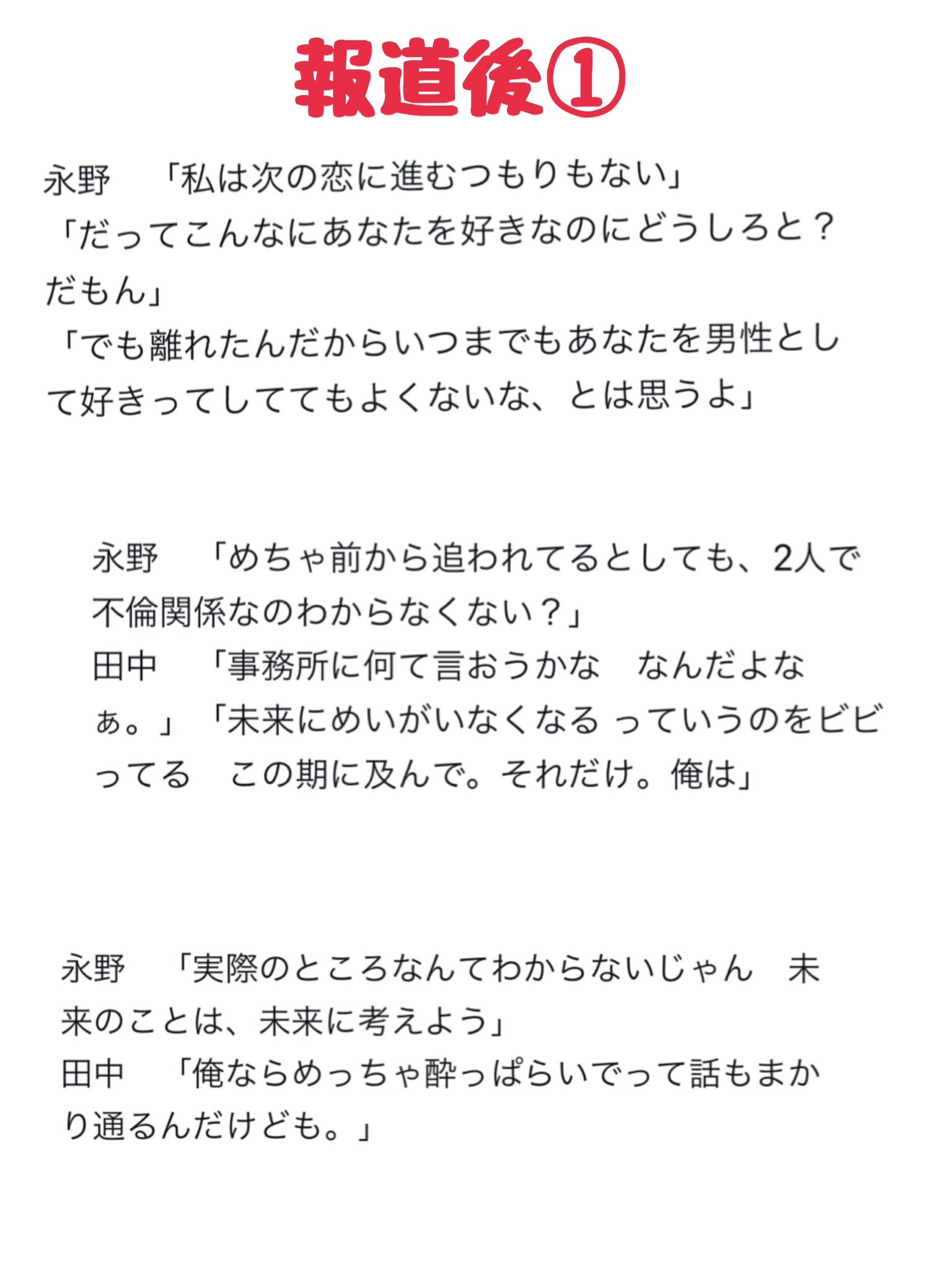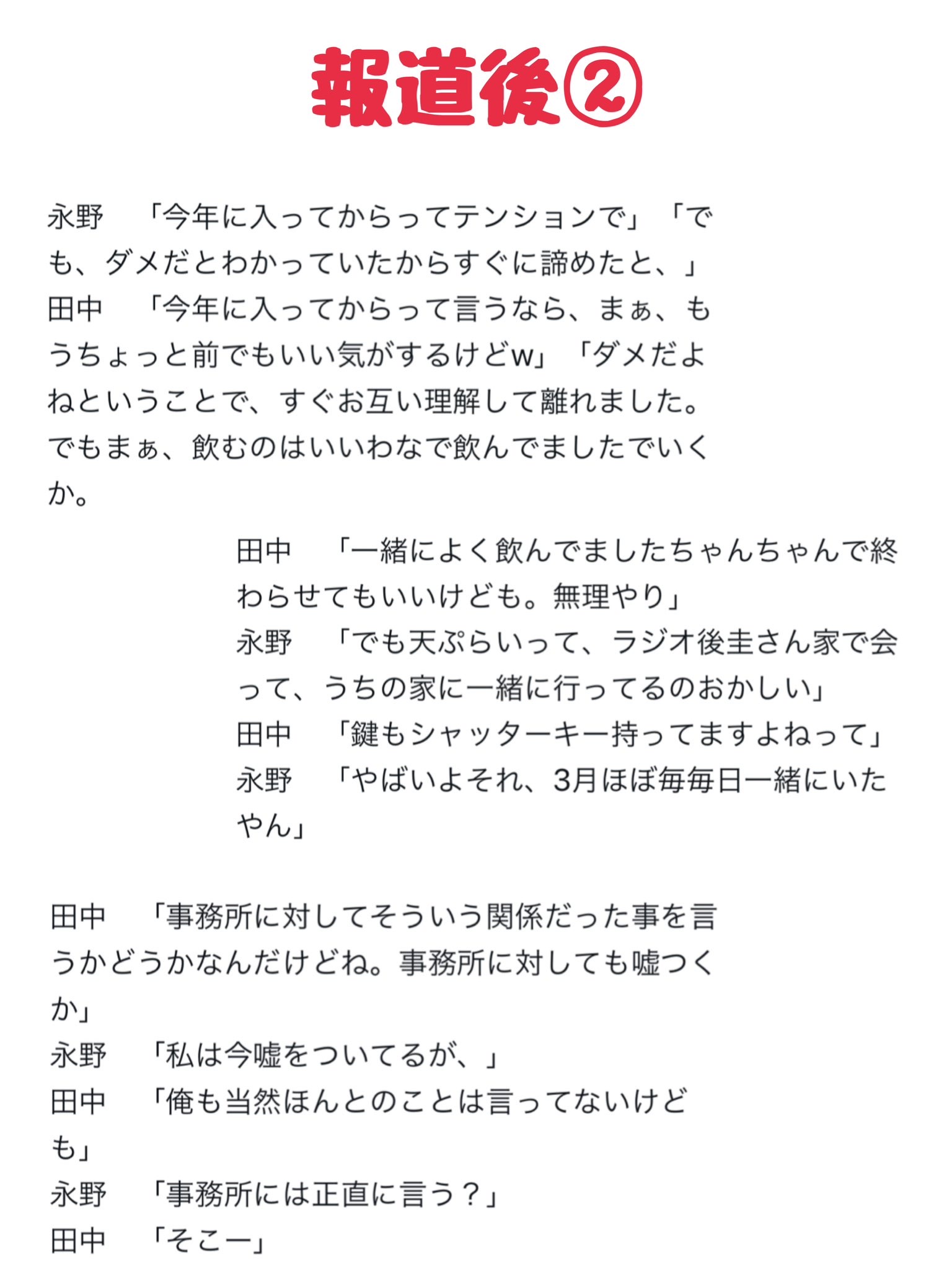 「一部報道にあるメッセージのやり取りについて永野本人に確認したところ、そのようなやり取りはしていないとのことです。なお、田中圭さんは俳優仲間の先輩のお一人であり、交際等の事実はございません。また、このような報道により、関係者の皆様、広告、作品等に関わるクライアントやスタッフの皆様、そして応援してくださっているファンの皆様に、多大なるご心配とご迷惑をお掛けすることを、深くお詫び申し上げます」と、LINEの内容や交際関係について否定しました。