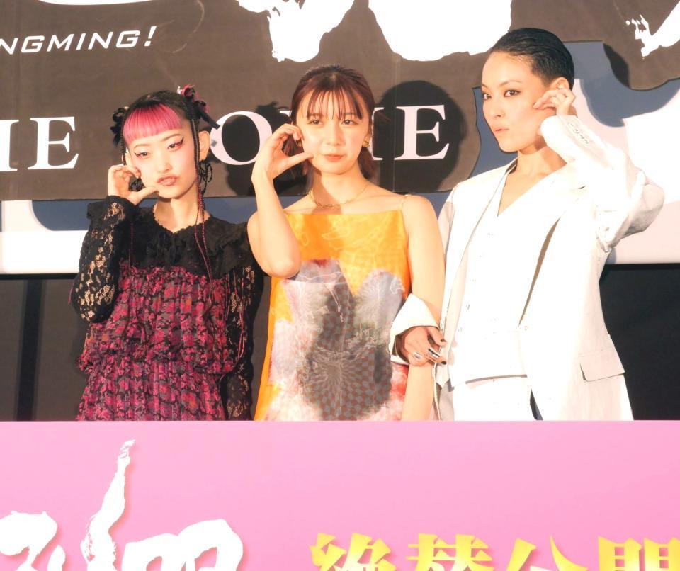 かわいらしくハートポーズを作り撮影に応じた(左から)詩羽、上白石萌歌、菅原小春