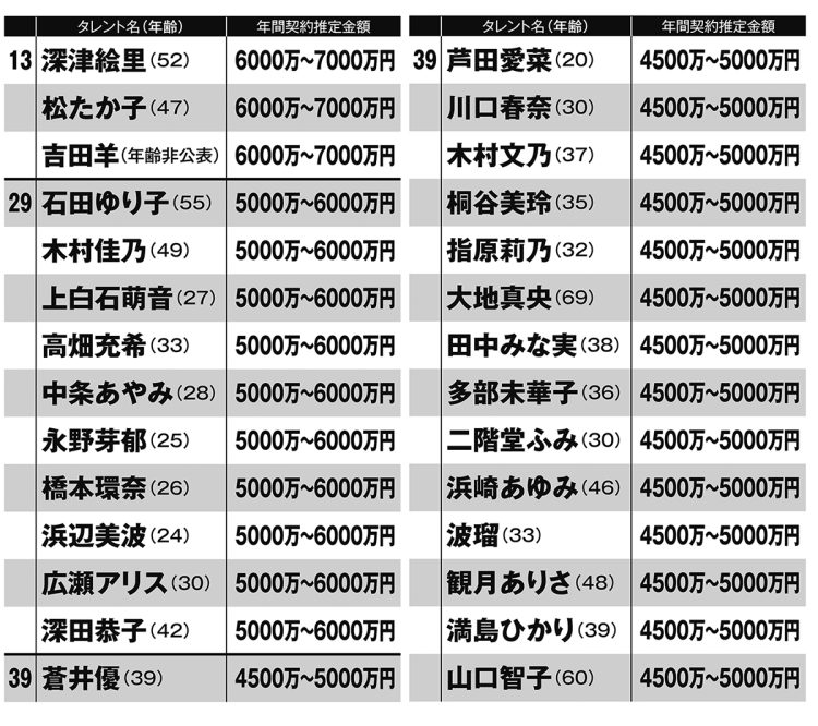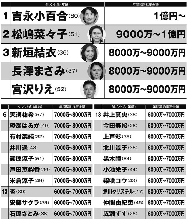 リストは金額順に並ぶが、「1億円」の大台に達したのが吉永小百合(80)と松嶋菜々子(51)。大手広告代理店のキャスティング担当者が語る。