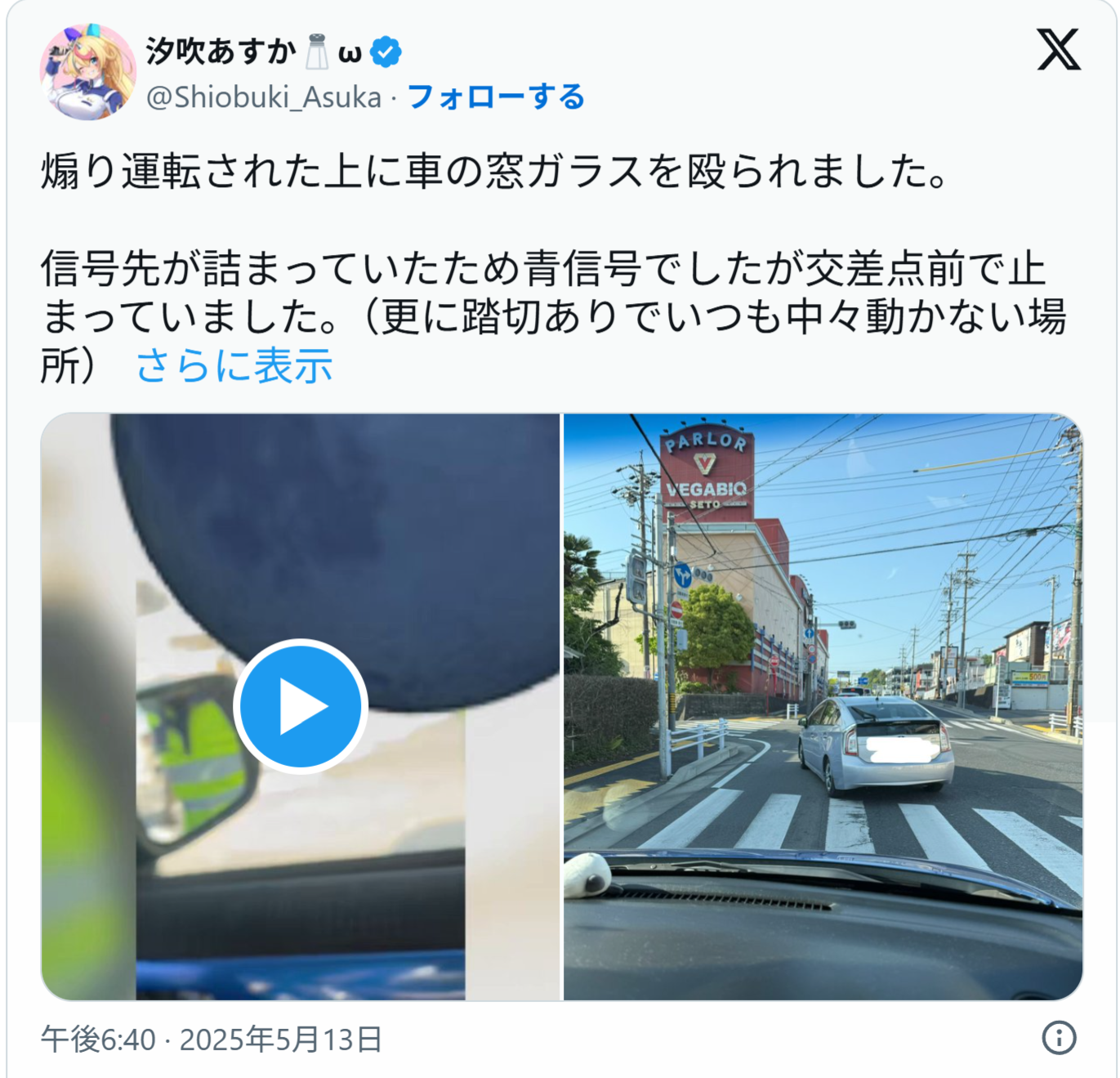 5月13日、プラモ製作やゲーム配信、歌ってみた動画を投稿する女性VTuberの「汐吹あすか」(登録者数1.1万人)がXに「煽り運転された上に車の窓ガラスを殴られました」と投稿。交差点の先が詰まっていたため、青信号のときに交差点の手前で停車していたところ、うしろの車から執拗にクラクションを鳴らされたそう。そのまま無視していると、運転手が車から降りてきて怒鳴りながら窓ガラスを殴ってきたのだとか。その後車に戻り、再びクラクションを鳴らした後に隣の車線から汐吹の車を追い越していったとのことです。
