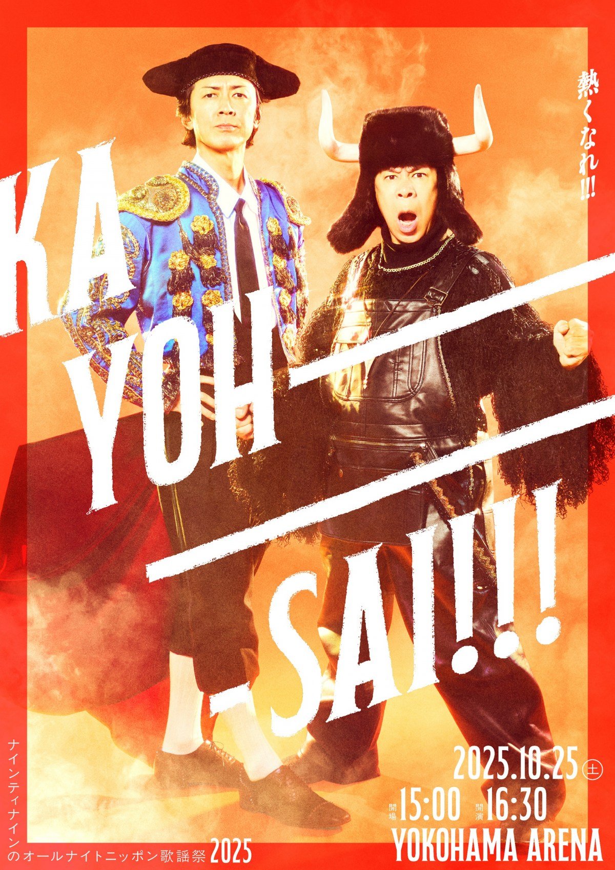 今年の「ナイナイ歌謡祭」のキャッチフレーズは「熱くなれ!!!」。このたび解禁されたイベントのキービジュアルでは、矢部浩之が闘牛士の衣装を身にまとい、岡村隆史が闘牛に扮している。スペインの情熱的な闘牛をモチーフに、「ナイナイ歌謡祭」の熱狂と盛り上がりを予感させるものとなっている。