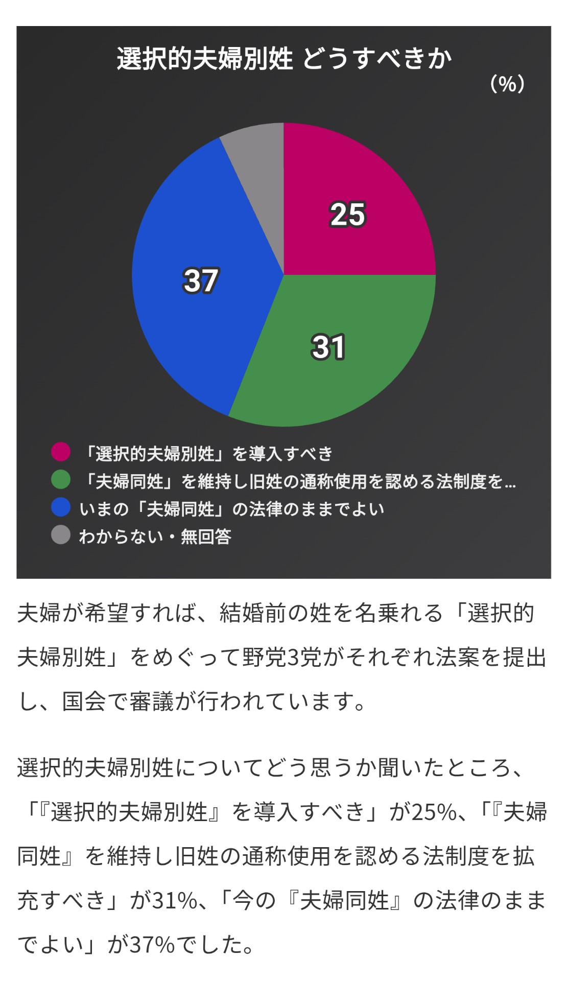 「『選択的夫婦別姓』を導入すべき」が25%、