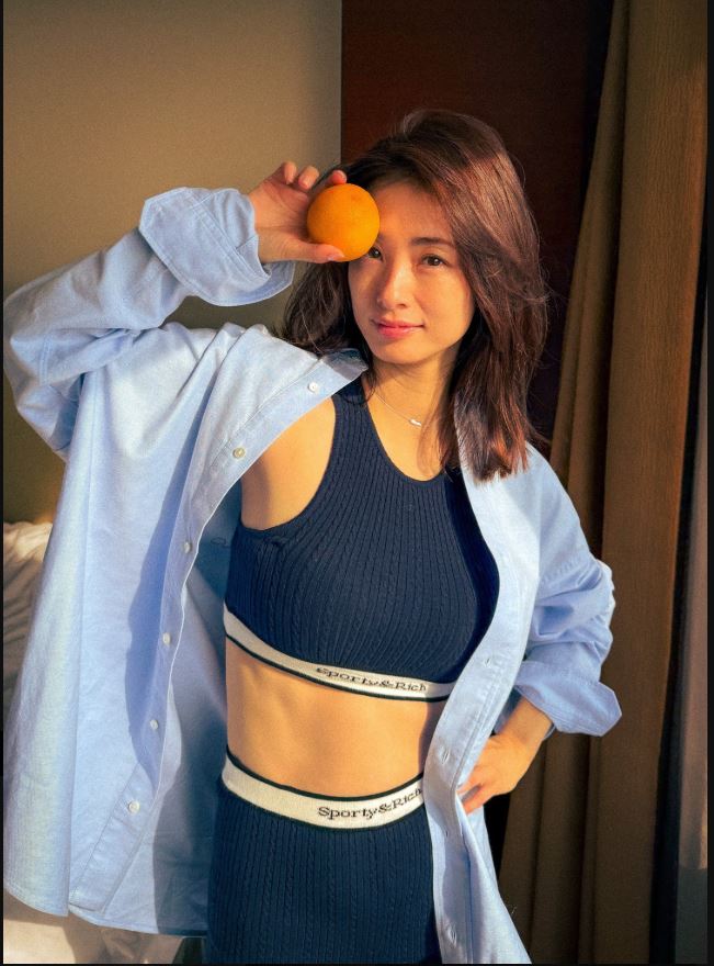 オレンジを持っている1枚では、大きく見せているお腹部分のナチュラルな曲線を描いた美しい腹筋の完璧なラインが際立っており、窓際の写真では抜群のスタイルや美脚ぶりも目立っている。