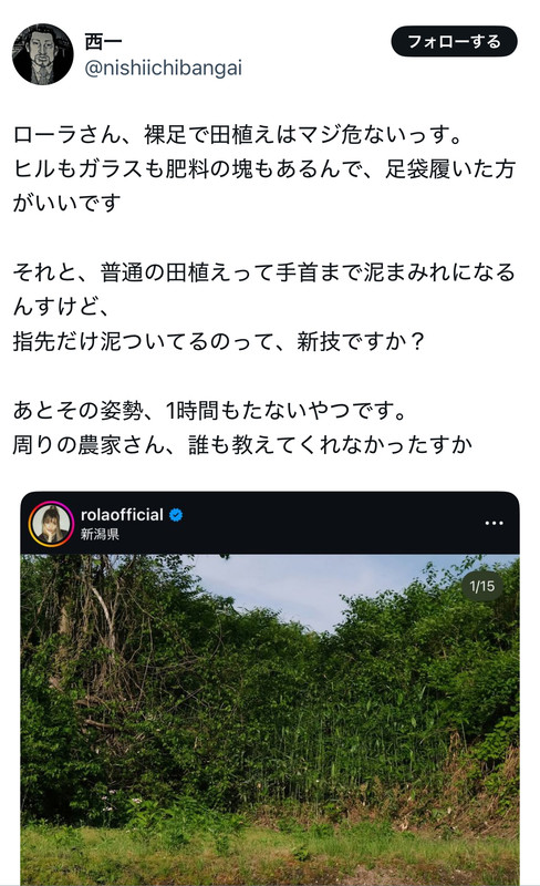 【画像】ローラさん、キラキラ田植えを行い無事批判される「裸足で田植えは危ない」