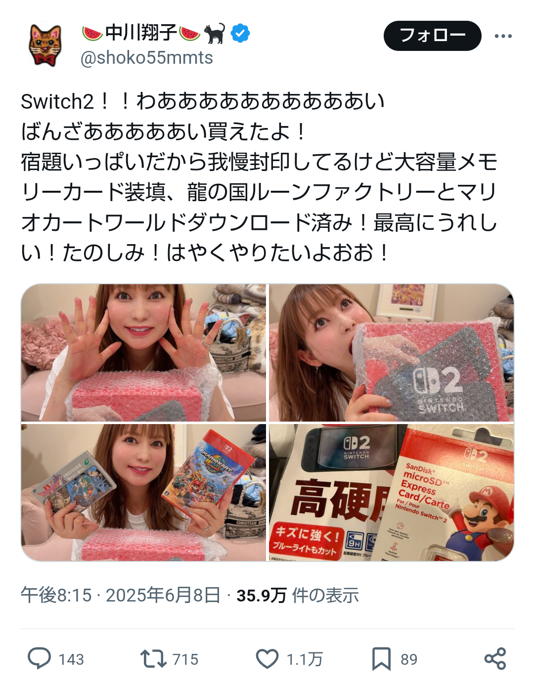 中川翔子さん「Nintendo Switch 2」を転売ヤーから買ったとの言いがかりを付けられ炎上中 可哀想に…