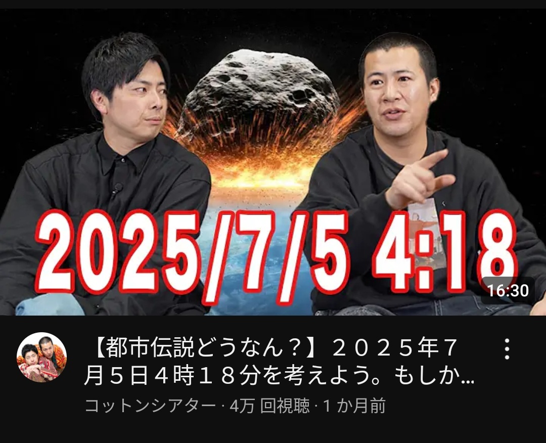信じる信じない以前に5日が災害起こる予言日だと思ってる知的レベルがヤバい - 79 : 2025/06/22(日) 21:08:40.88 ID:LXt9VGuM0