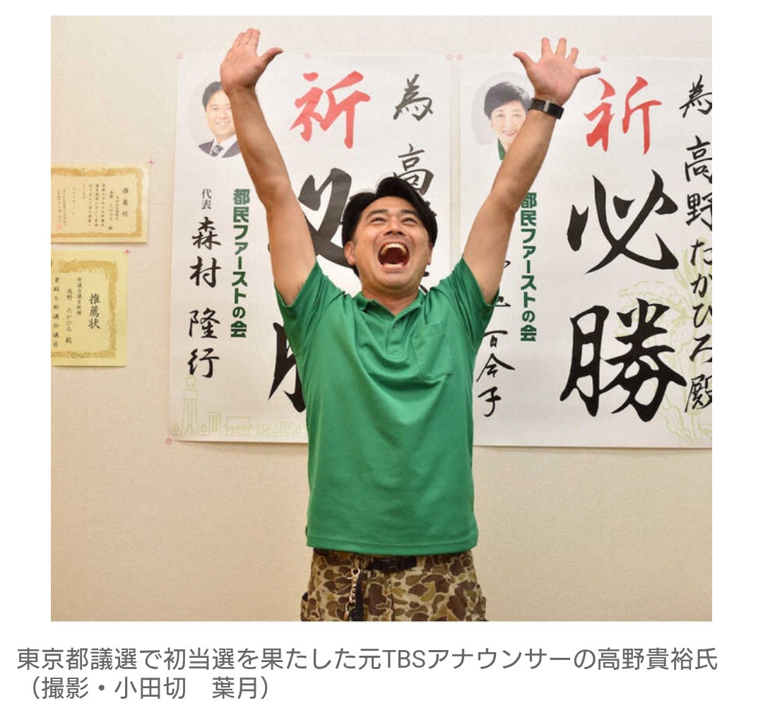 東京都議選の投開票が22日に行われ、世田谷選挙区に都民ファーストの会から立候補した元TBSアナウンサー、高野貴裕氏(45)が初当選を確実にした。