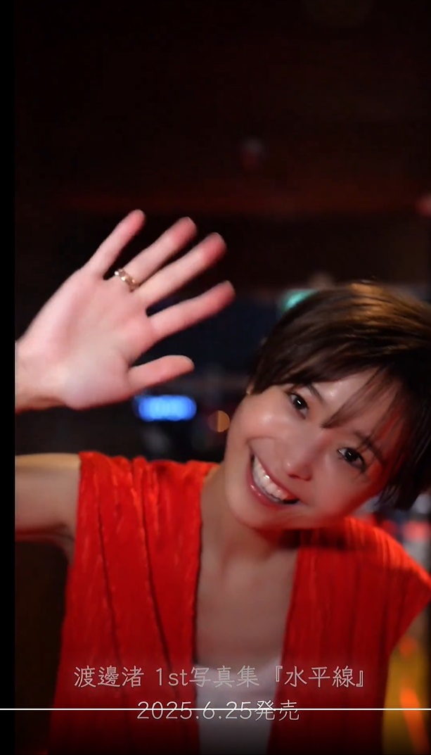 白いインナーに赤のトップスを合わせ「渡邊渚 写真集発売まであと2日です! イェイイェイイェイ見てね~!」と言って手を振った。