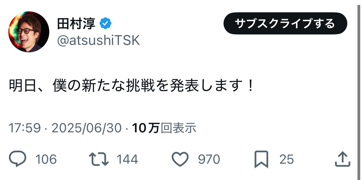元ロンブー1号2号田村淳さん「明日、僕の新たな挑戦を発表します!」