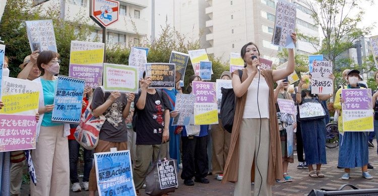 集まった市民ら約150人は「女の価値を産む産まないで決めるな」「少子化を女のせいにするな」などと書かれたプラカードを手に、思い思いの気持ちを語った。