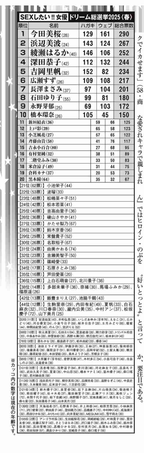 セクロスしたい女優ドリーム総選挙2025春の結果が出る 広瀬すず6位後退