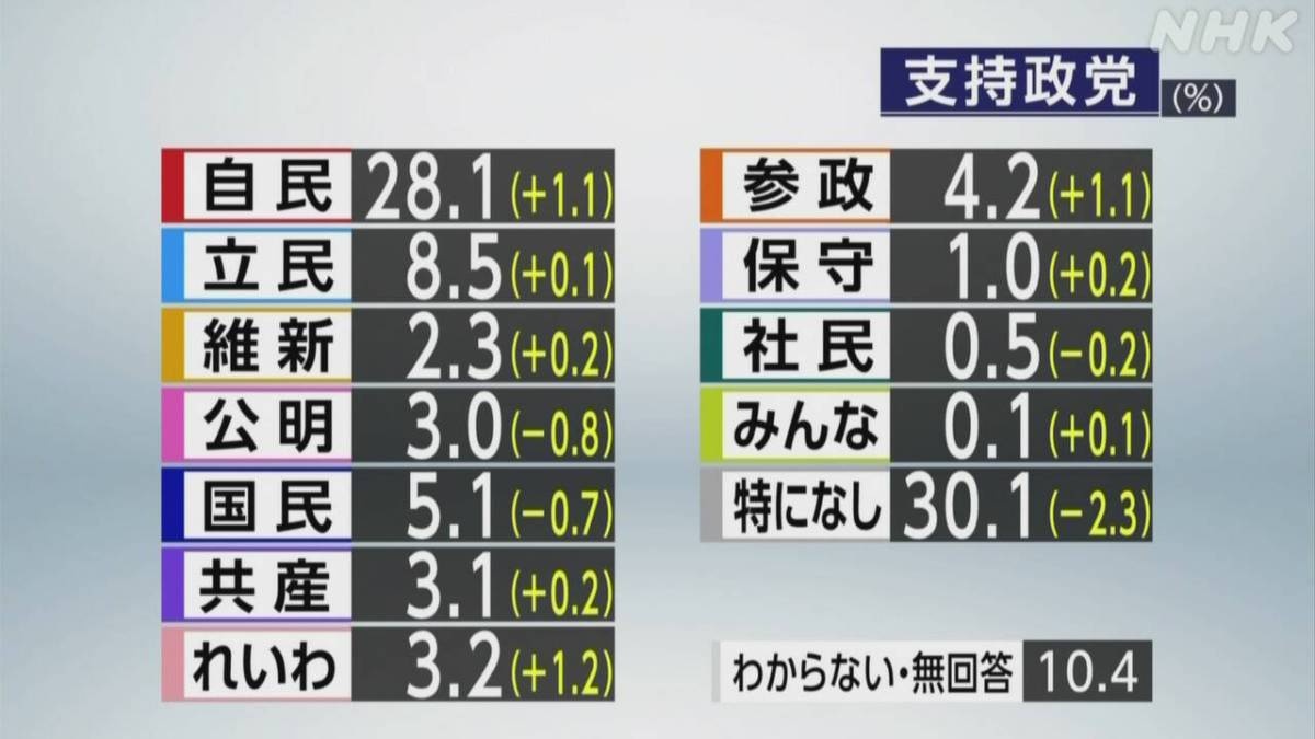 「自民党」が28.1%、「立憲民主党」が8.5%、「日本維新の会」が2.3%、「公明党」が3.0%、「国民民主党」が5.1%、「共産党」が3.1%、「れいわ新選組」が3.2%、「参政党」が4.2%、「日本保守党」が1.0%、「社民党」が0.5%、「みんなでつくる党」が0.1%、「特に支持している政党はない」が30.1%でした。