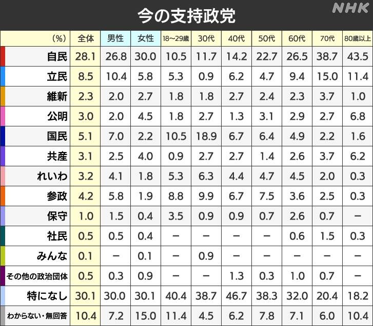 立憲民主党は、70代以上では10%台であるのに対し、60代以下では1桁でした。