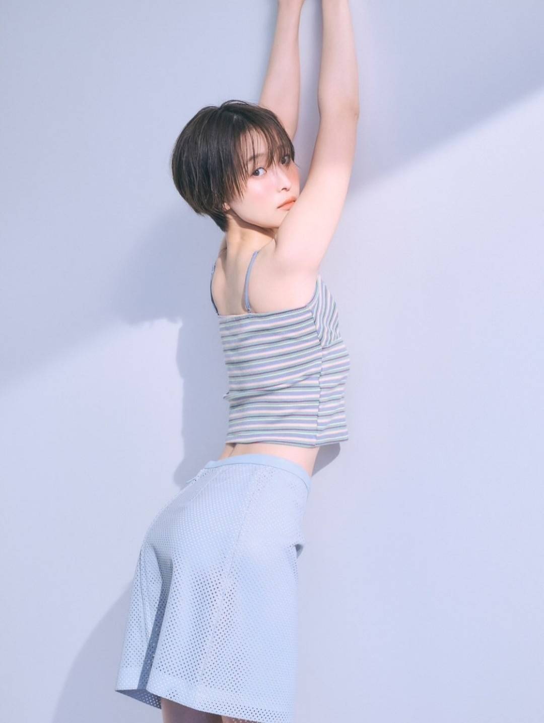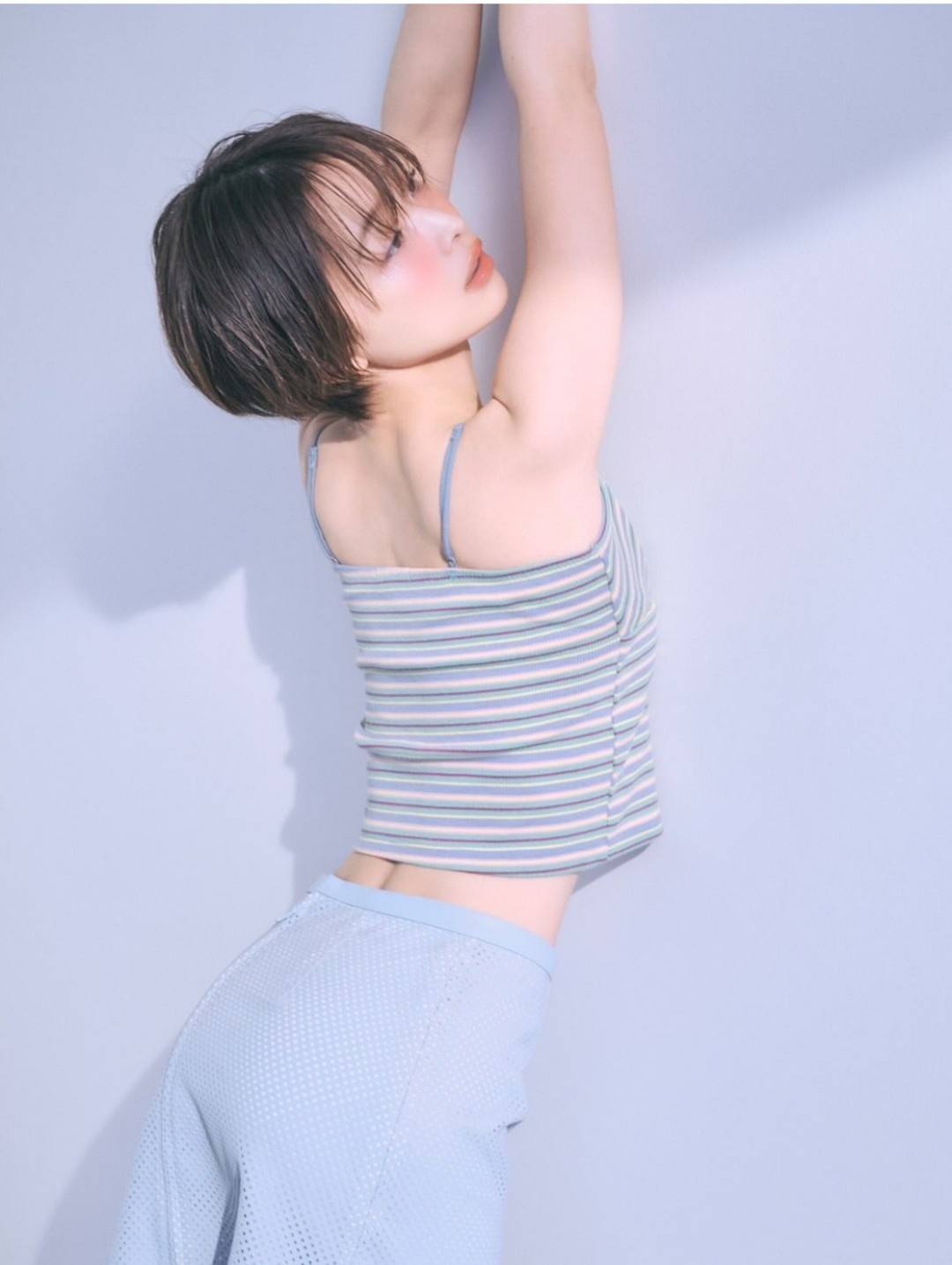 渡邊さんはミニ丈のキャミソールを身に着け、両腕と背中に伸ばしたポージングで、背中や脇腹があらわになっている。