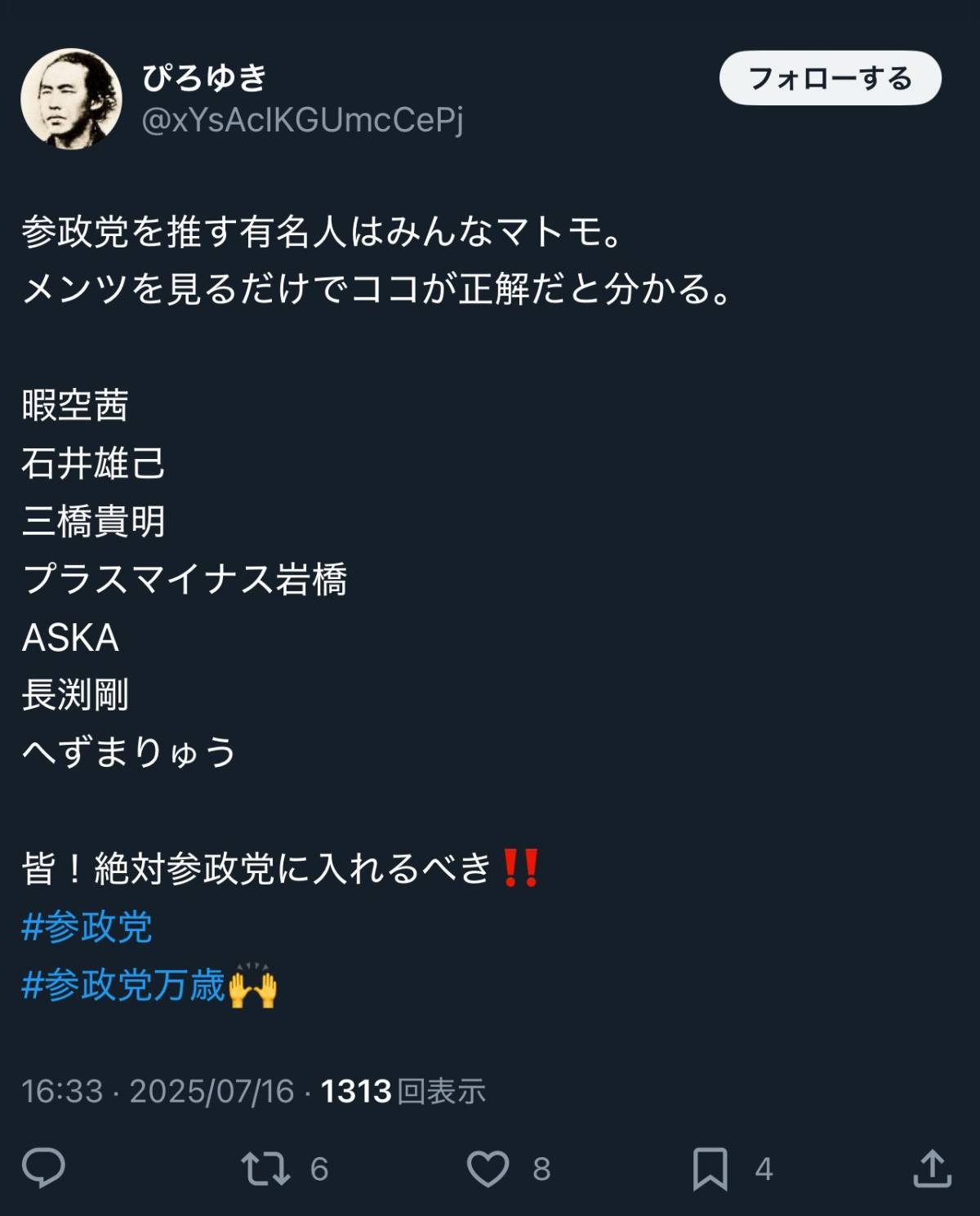 【日本朗報】参政党支持の有名人、マトモすぎるwww