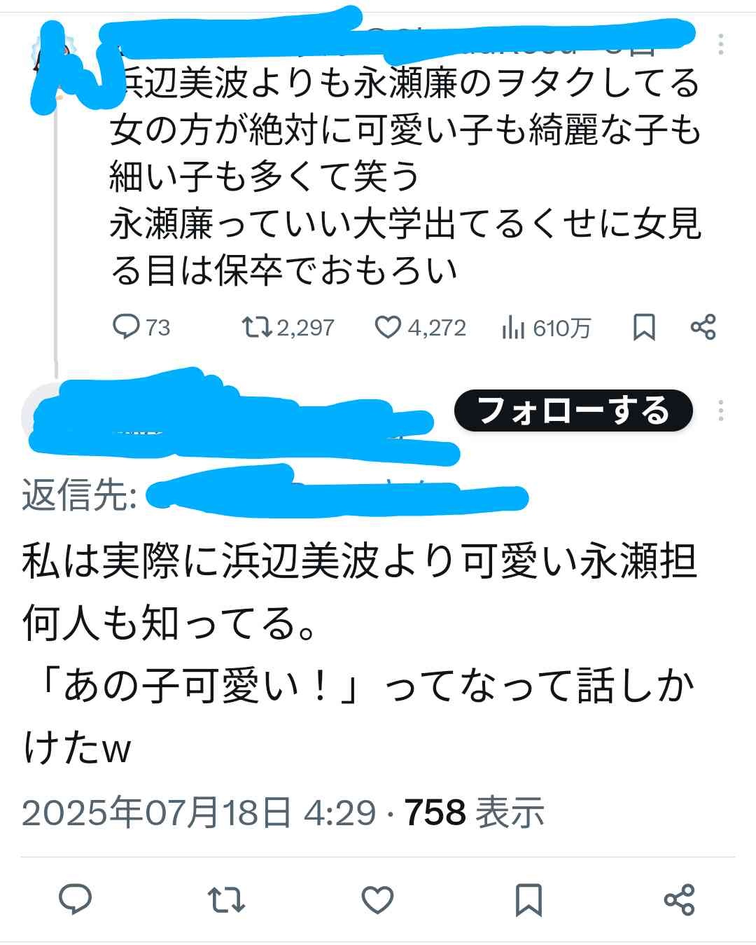 浜辺を下げたらその永瀬ってやつも馬鹿にしてることになるって気づかないのか