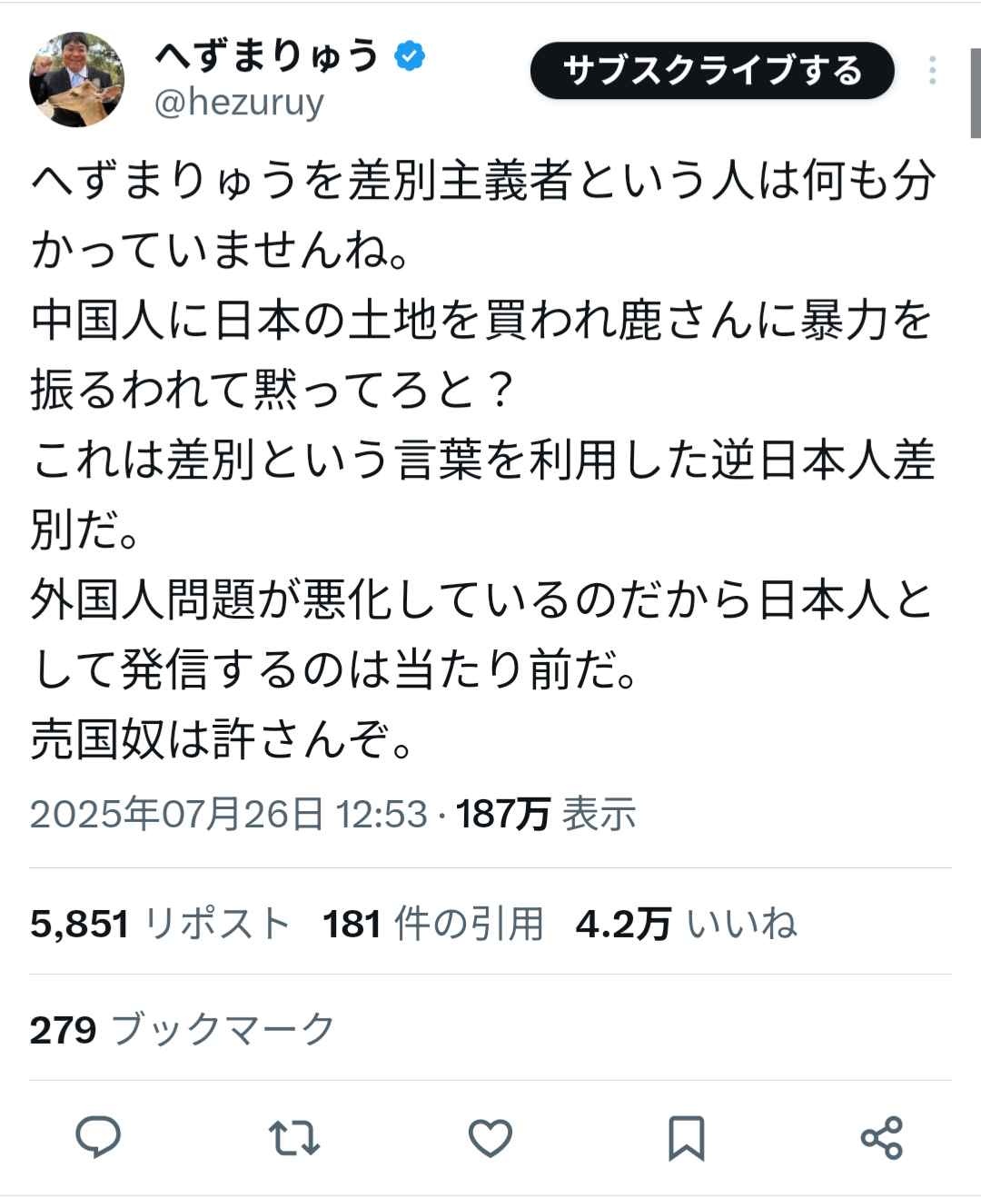 売国奴は許さんぞ。 奈良市議へずまりゅう氏効果!?「中国人が日本へ旅行に来ない運動…本当なら大功績を残せそう」 - 社会 : 日刊スポーツ20日投開票の奈良市議選で初当選を果たした元迷惑系ユーチューバー、無所属新人の動画配信業へずまりゅう氏(34)が24日までにX(旧ツイッター)を更新。自身の当… - 日刊スポーツ新聞社のニュースサイト、ニッカンスポーツ・コム(nikkans...www.nikkansports.com