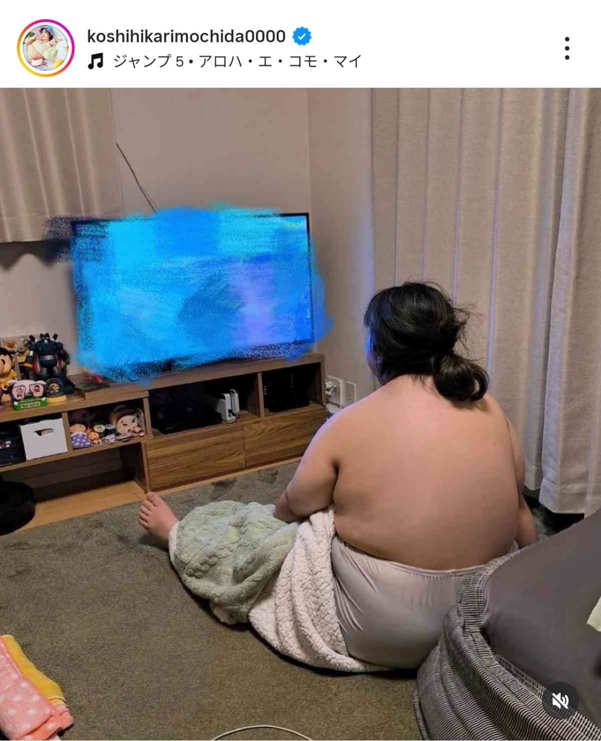 餅田さんはインスタグラムで「背中で語る」と切り出し、テレビを見ているのだろう、部屋でくつろぐ自身のバックショットを公開した。