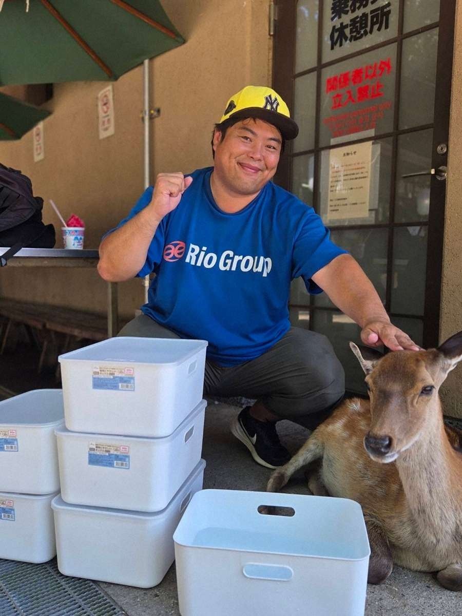 午後7時には「ひとまず安心して下さい。お店の方にお願いして鹿さんにお水を与えるようお願いして回りました」とつづり、水を入れるための容器と鹿と一緒に映った自身の写真を投稿した。
