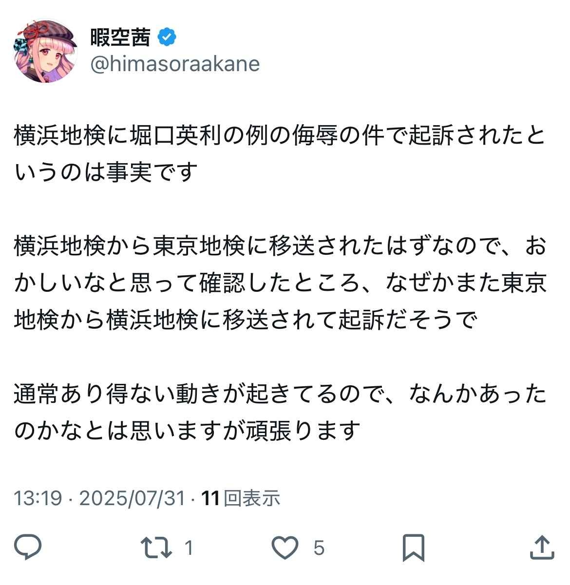 >横浜地検に堀口英利の例の侮辱の件で起訴されたというのは事実です