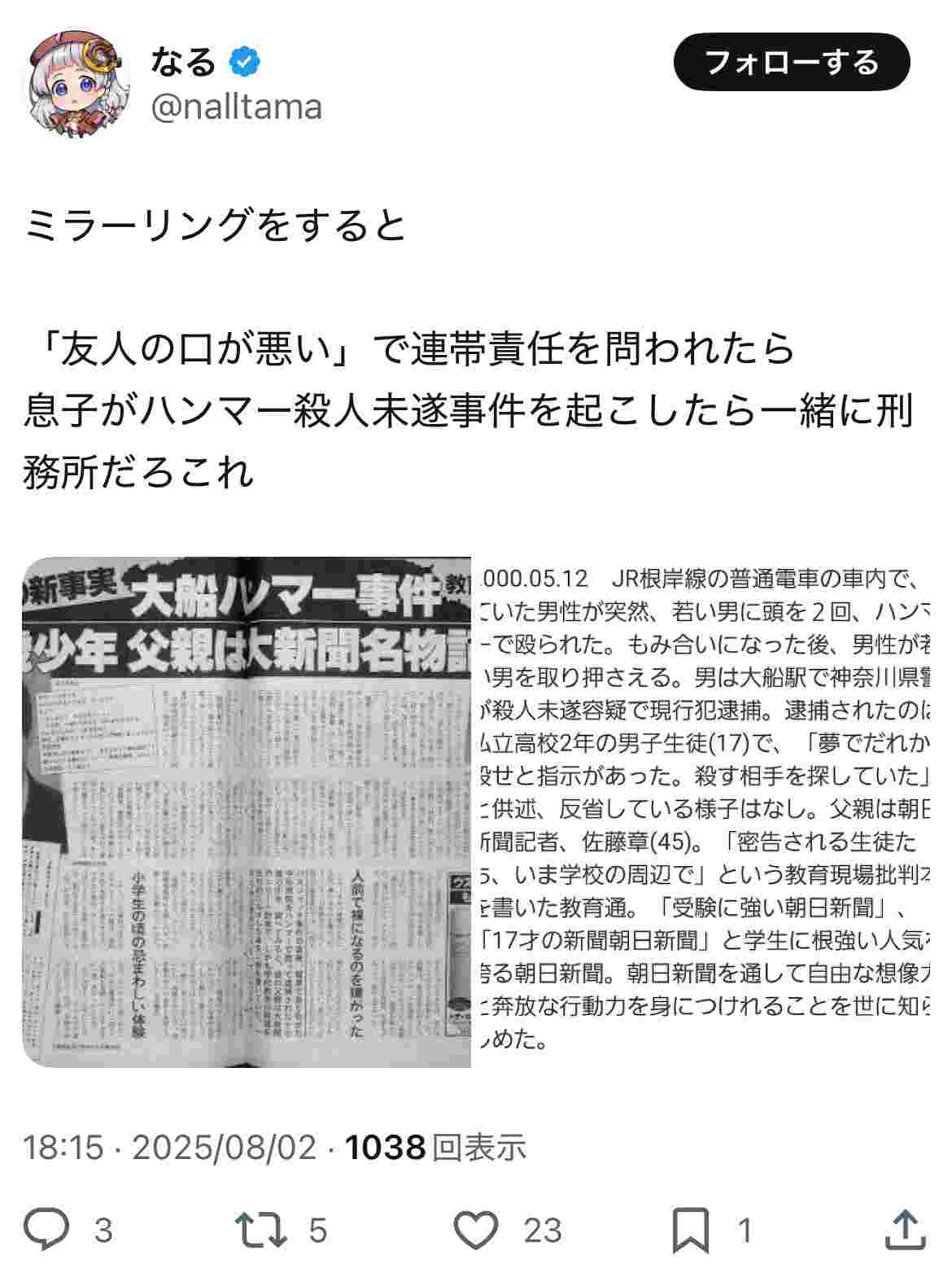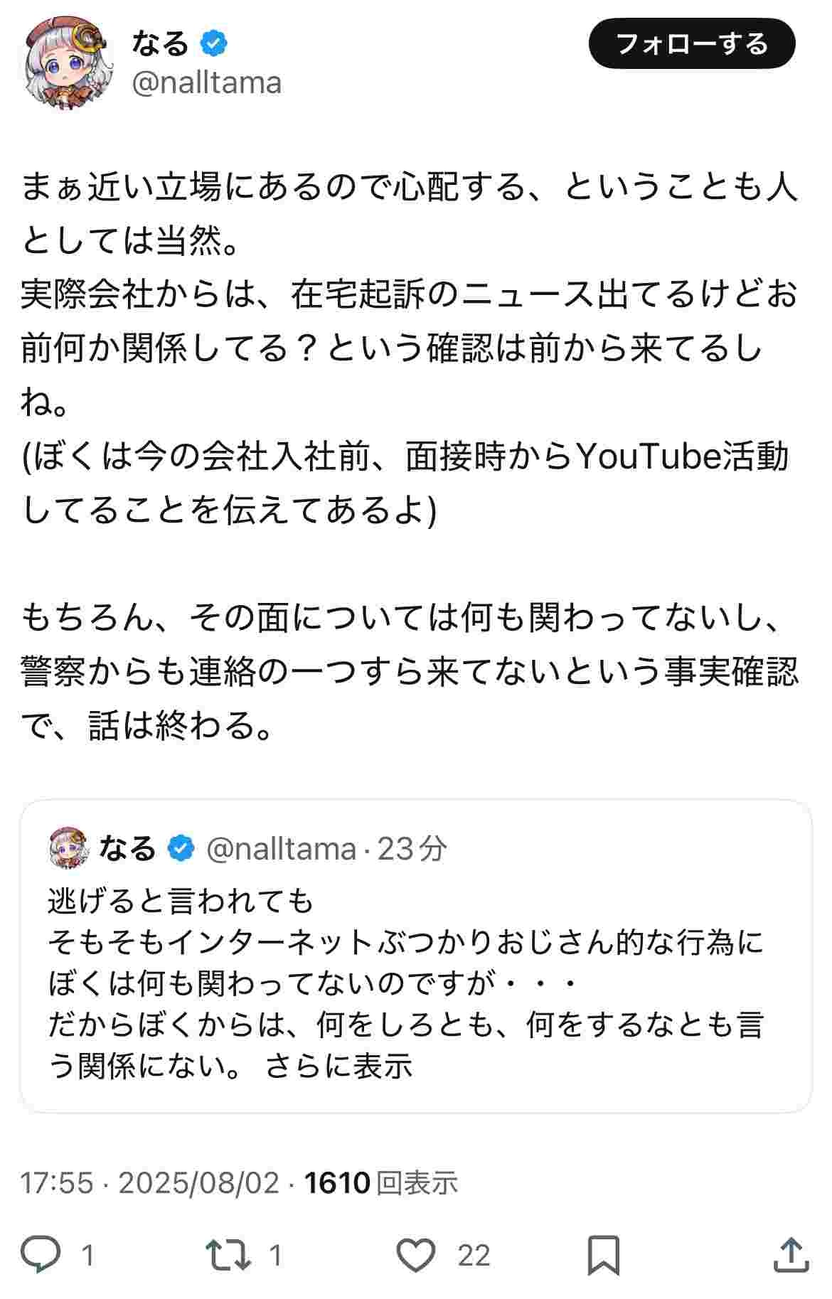 なるのアカウントで誹謗中傷をやってるんじゃなかったの?