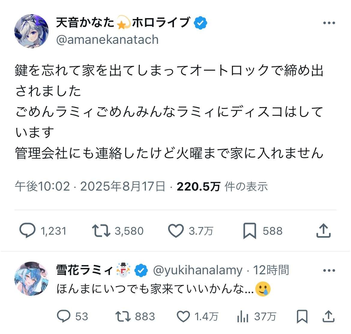 ホロライブVTuber、鍵を忘れて家を出てオートロックに締め出されてしまう…!
