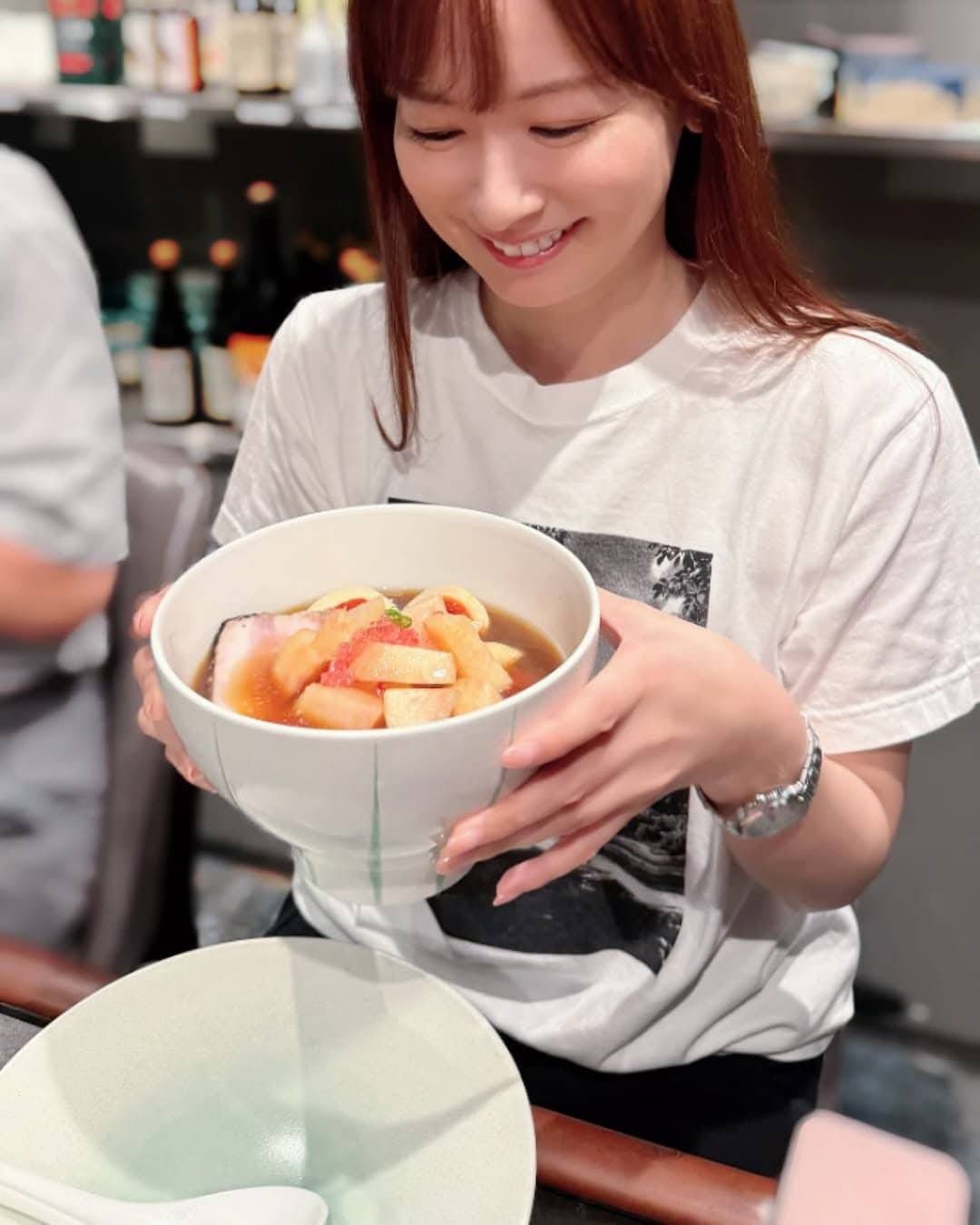 投稿された写真には、皆藤さんが白いTシャツを着て、大きな丼を前に笑顔を見せる姿が写っています。