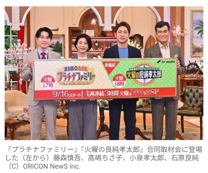 テレビ朝日系バラエティー『プラチナファミリー 華麗なる一家をのぞき見』、『日本探求アカデミックバラエティ 火曜の良純孝太郎』に出演する石原良純、小泉孝太郎、高嶋ちさ子、藤森慎吾がこのほど、合同取材会を開催。特別企画「4週連続3時間 火曜はプラチナな夜SP」を放送することを発表した。
