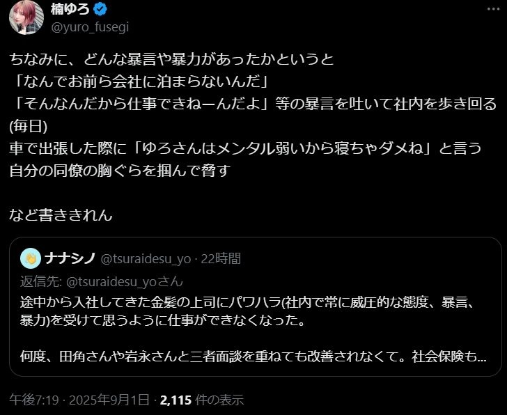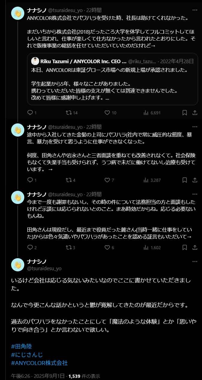 にじさんじに勤めてた元スタッフが在籍時に上司から暴力や暴言などのパワハラを日頃から受けていて、それを社長に相談しても助けてくれなかったこと、そのせいで鬱を発症して退職する羽目になったこと、未だに会社から謝罪すらないことを告発