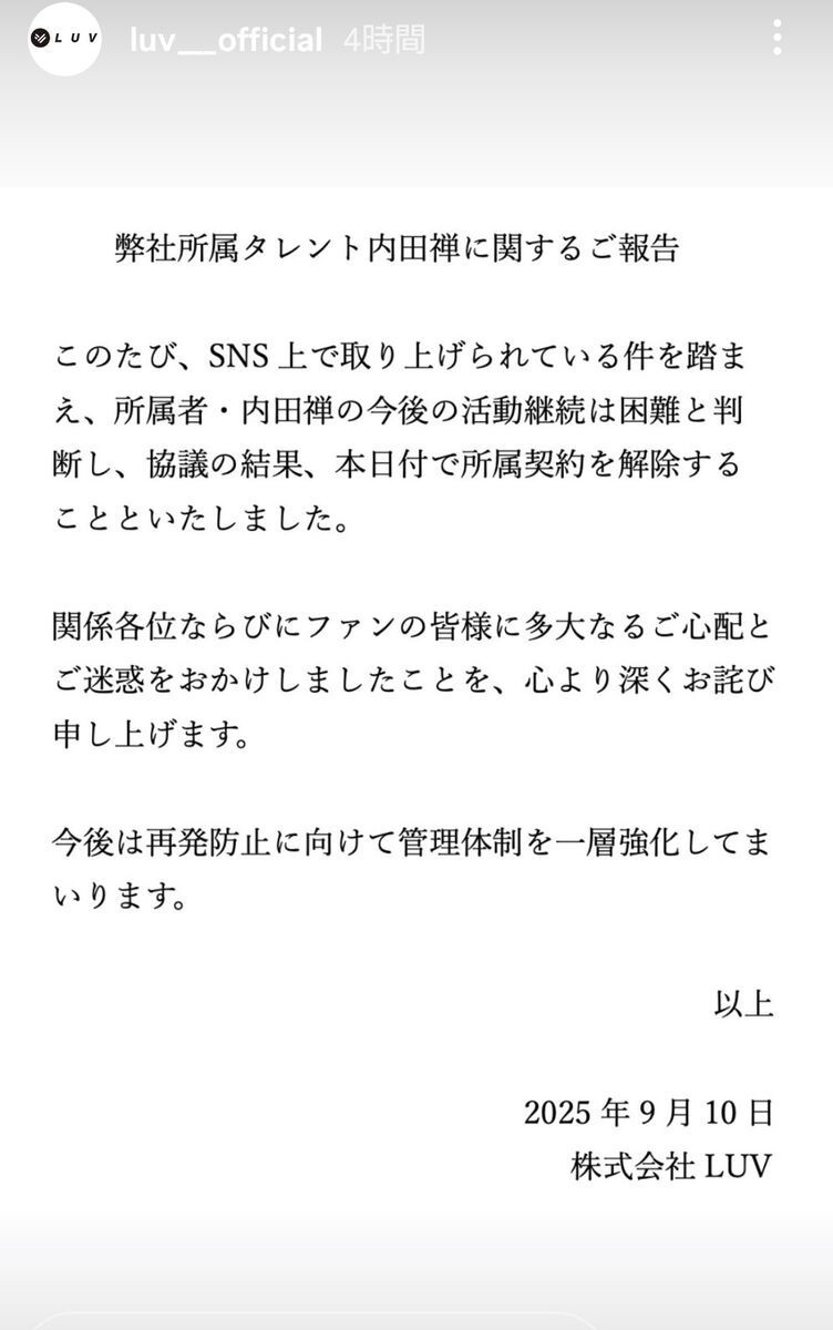 芸能事務所「LUV」、所属タレントの契約解除を発表「SNS上で取り上げられている件を踏まえ…活動継続は困難と判断」(スポーツ報知)