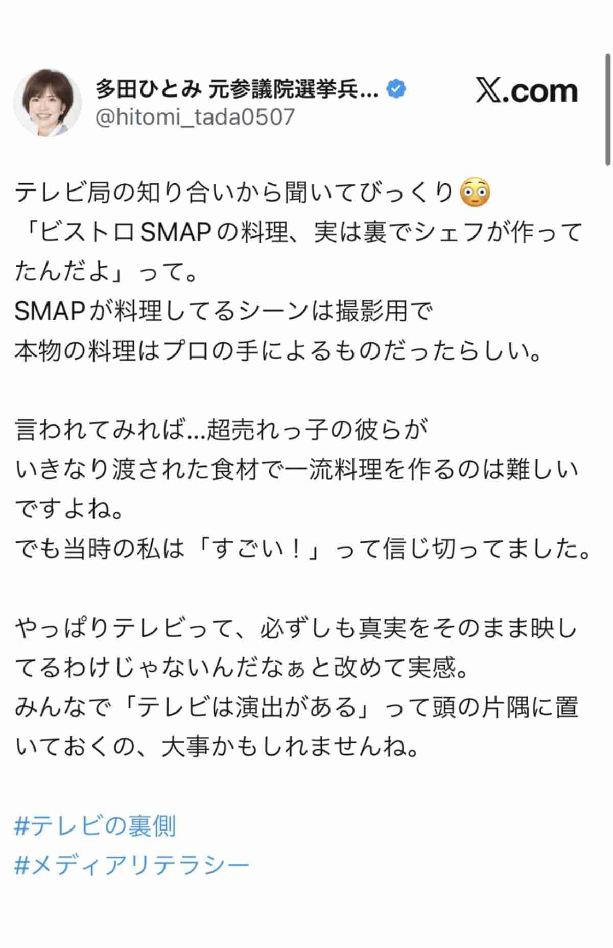 「テレビ局の知り合いから聞いてびっくり『ビストロSMAPの料理、実は裏でシェフが作ってんだよ』って。SMAPが料理してるのは撮影用で本物の料理はプロの手によるものだったらしい。言われてみれば…超売れっ子の彼らがいきなり渡された食材で一流料理を作るのは難しいですよね」(原文ママ)と、テレビには演出があるという点を伝えたかったようだ。
