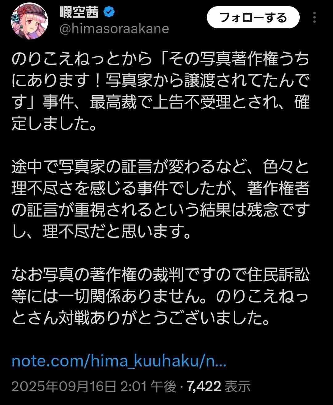 暇空のいう「著作権者」はカメラマン、カメラマンの「のりこえネットが著作権者です」という証言が採用されたことがご不満