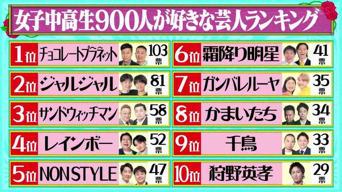 女子中高生が好きな芸人ベスト10がこちら。流石に全員知ってるよね?