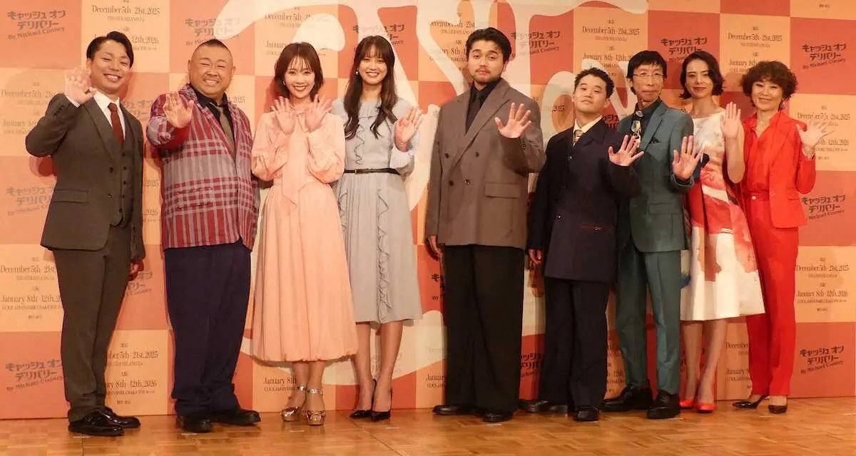 https://www.sponichi.co.jp/entertainment/news/2025/09/17/kiji/20250917s00041000051000c.html?page=1舞台「キャッシュ・オン・デリバリー」の会見に出席した(左から)演出の小貫流星氏、脇知弘、妃海風、山崎紘菜、井口理、矢本悠馬、小松和重、まりあ、明星真由美 Photo By スポニチ