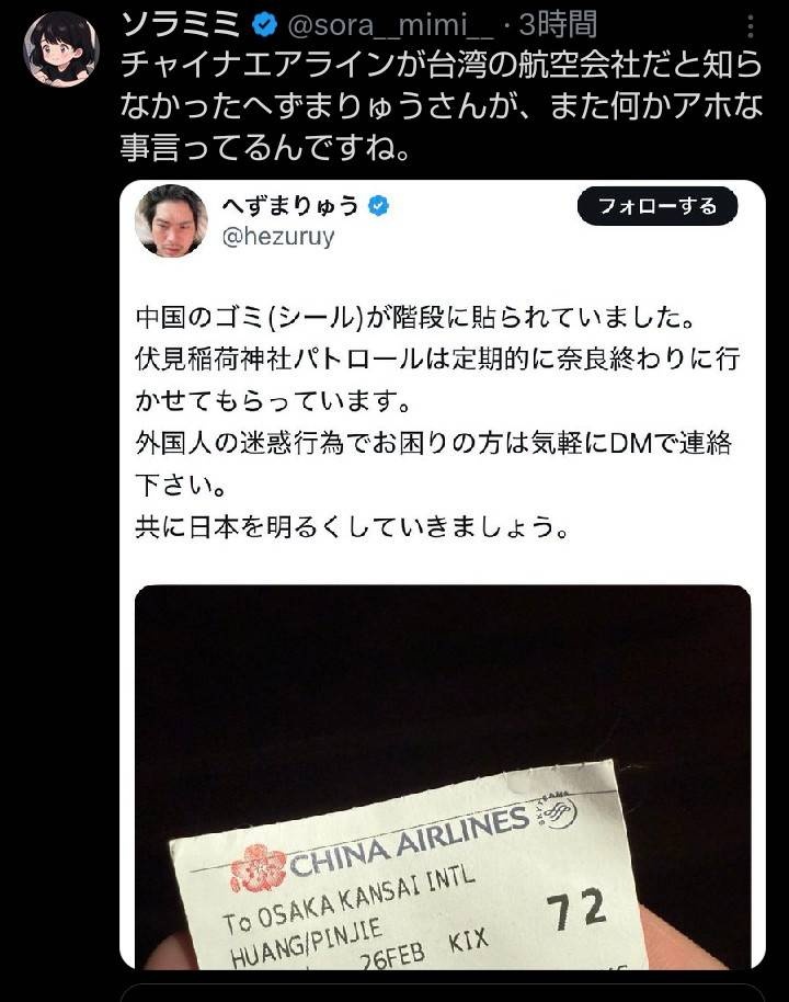 へずまりゅう「中国のゴミシールが京都に貼られてました」台湾のゴミでした