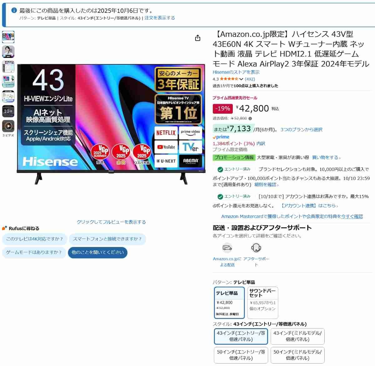 昨晩6畳間の居間のテレビ購入で相談したものだけど結局これ買ったよ