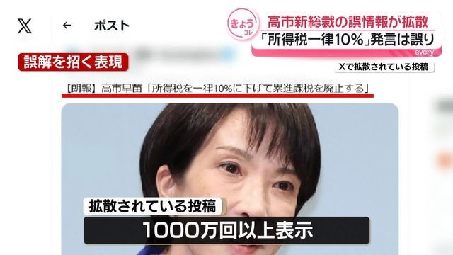 拡散されている投稿は5日のもので、「【朗報】高市早苗『所得税を一律10%に下げて累進課税を廃止する』」と書かれています。この投稿は6日までに1000万回以上、表示されています。この投稿のもとになったインターネットのまとめサイトの記載には「自民・高市早苗新総裁が記者会見」「所得税率の累進課税を廃して一律10%程度に設定」などと書かれています。