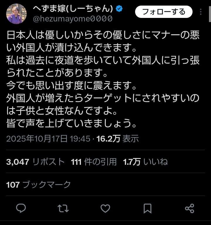 へずま嫁「日本人は優しいからその優しさに外国人が漬け込んできます。日本人女性として声を上げ続けます」